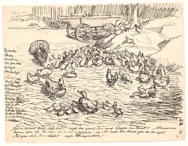 Curator: So, let's look at Fritz Syberg's 1928 ink drawing, currently held at the Statens Museum for Kunst. It's titled "Og saa kom de ind i Andegaarden..." which translates to "And so they came into the Duck Yard…" Editor: Right. My first impression? Chaos. Energetic, delightful chaos. Look at those frantic little ducks, all rendered with such wild, scratchy lines! It feels like a snapshot of pure, unadulterated duck-y pandemonium. Curator: Absolutely. And it’s interesting to consider how this seemingly simple, almost off-the-cuff sketch, speaks to broader issues. Consider Syberg’s position as a socially conscious artist. How does portraying this domestic scene engage or perhaps subtly critique ideas around labor and the family in early 20th-century Denmark? Editor: Hmm, I dunno about all that! To me, it screams immediacy, like he just HAD to capture this moment before it flew away, like, you know, a duck. There's a raw, almost scribbled quality, like a quick note jotted in a sketchbook. You can feel the movement, the sound, the... well, the duck-ness! It just dances off the page. I can almost smell the pond scum. Curator: Precisely! And within the context of his broader body of work, the sketch offers valuable insights into his landscape style. His skillful application of ink, in what could easily have felt merely utilitarian, allows for an unencumbered vision into the reality of that barnyard—almost a stream of consciousness visual diary entry. Editor: See, that’s where it gets fascinating. We think of the great masters spending countless hours crafting perfection, but sometimes the real magic happens in these stolen moments. These impulsive gestures on paper. You catch more of the artist, warts and all! The vulnerability and, you know, it's totally ducky. Curator: Exactly, that element of the unrehearsed and “real” that the artist captures allows for art history and social commentary to combine toward discourse, encouraging a wider narrative of how art reflects the every day. Editor: Ultimately, the piece makes you want to grab your own pen and immortalize the small dramas unfolding around you. It reminds us that art doesn’t always need to be grand or imposing; it can be found in the simple, the messy, the beautifully chaotic, utterly quacking moments of life.