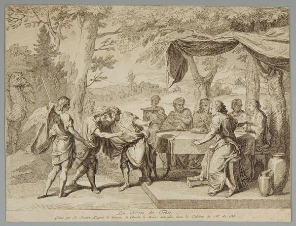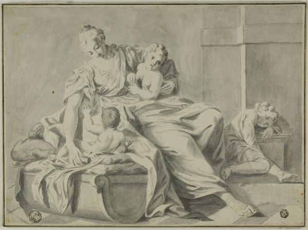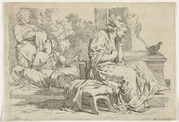 Editor: So, this is Gérard de Lairesse's "Silence and Flippancy." It's an etching, and I find the contrast between the figures really striking. What do you see in this piece? Curator: The print stages a crucial debate about gendered expectations. The woman choosing silence by the incense burner embodies idealized virtue, while the pointing woman embodies the social transgression of flippancy. But is silence necessarily virtuous, especially when it masks complicity or injustice? How do we grapple with the power dynamics inherent in prescribing silence to certain groups? Editor: So you're saying it's not just about good and bad, but about who gets to speak and who doesn't? Curator: Exactly. It forces us to confront historical silencing and how it perpetuates inequalities. Lairesse's image then becomes a provocation, urging us to examine whose voices are amplified and whose are suppressed. Editor: That's a powerful way to look at it. I'll never see this print the same way again!