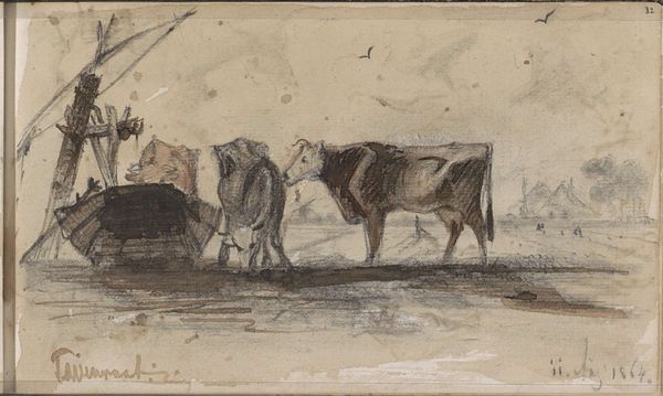 David Cox painted this 'Study of a Donkey' using oils. Immediately, you're drawn to the stark contrast between the animal's solid form and the fluid, almost abstract background. Cox masterfully balances representation with suggestion. Notice the way the donkey's body is rendered with a tangible weight, through visible brushstrokes, and the way its muted palette emphasizes earthiness. This groundedness is then set against a backdrop of loosely defined space with horizontal lines that hint at land and sky. The composition’s structure invites us to question conventional landscape painting. The donkey, traditionally a symbol of burden, is presented here with a dignity that challenges fixed meanings. Consider how Cox’s artistic choices—his use of color, texture, and form—invite us to reinterpret this animal, not merely as a beast of burden, but as a subject worthy of contemplation. This study, through its formal qualities, prompts a deeper understanding.