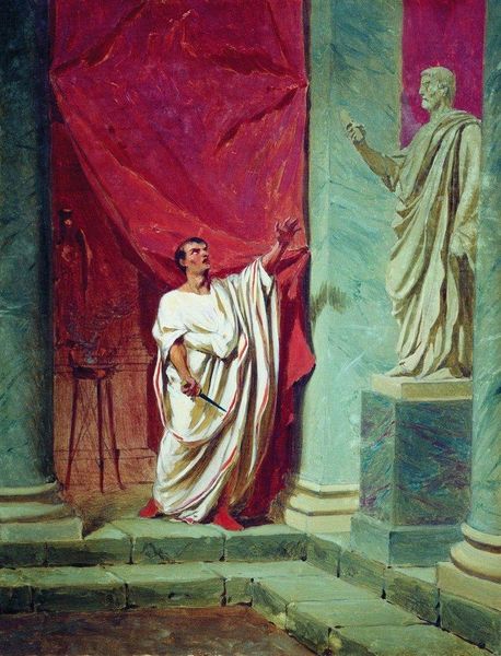 Editor: Bronnikov's "Martyr on a Circus Ring," painted in 1869 with oils, presents such a stark scene. The woman in white stands out, while the looming danger creates a palpable tension. What strikes you when you look at it? Curator: I am drawn to the way the artist uses the imagery of the arena to evoke a complex cultural memory. Think about it - the arena as a symbol of power, of spectacle, of life and death played out for an audience. How does the positioning of the woman within this space affect your perception of her faith? Editor: It definitely highlights her isolation, like she's completely alone with her faith in the face of this massive, bloodthirsty system. Curator: Exactly. And consider the tiger. What does the inclusion of this particular animal tell us? It’s not just any predator, but one often associated with exoticism, untamed nature, the ‘other.’ What anxieties or fascinations about the ‘other’ do you think this painting might be tapping into? Editor: I guess it's easy to see the "civilized" versus "uncivilized" idea being portrayed, with her as the pinnacle of morality about to be destroyed by this wild beast for the amusement of others. The cultural symbolism layered here is fascinating. Curator: It is. Notice how Bronnikov isn’t simply depicting a historical event; he is also creating a powerful symbol about the conflict between faith and power, individual versus empire, and civilization versus primal instinct. These symbolic confrontations resonate even today. It challenges us to consider our own complicity as spectators. Editor: I hadn't thought about it like that, but you're right; even now, we're part of the audience observing this moment. Curator: Yes, and in a way, this piece challenges us to reconsider the images and narratives that shape our understanding of the world. Editor: This painting is so much more than just a scene of martyrdom; it's a mirror reflecting our own cultural biases. Thanks!