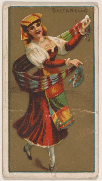 Curator: Here we have "Highland Fling, from National Dances," a print issued by Kinney Brothers Tobacco Company in 1889, now held at the Metropolitan Museum of Art. It seems like a delicate watercolor illustration on paper. Editor: Oh, she's pure joy, isn't she? All bright tartan and energetic pose! I get a feeling of exuberance, almost like she could just leap right off the… cigarette card? That’s what this feels like. Curator: Precisely! These were trade cards included in cigarette packs. It is intriguing how themes of nationhood and cultural identity were used to market a global commodity. In this case, the "Highland Fling" becomes a symbol, likely disconnected from any real understanding of Scottish culture but readily consumable nonetheless. Editor: So it’s about flattening the world into little bite-sized stereotypes for commerce, packaged with something that will give you cancer...nice! But I also find it aesthetically quite charming, there’s a vibrant life to the movement captured in the dance, which overrides some of the problematic layers. I see echoes of Japonisme in the flat background and graphic lines, wouldn't you agree? Curator: Indeed. The influence of Japonisme is certainly evident in the flattened perspective and bold graphic style. It is worth exploring how the appropriation of artistic styles coincided with imperial expansion and the objectification of cultures. This commercial image participated in circulating ideas about nation, gender, and performance—solidifying cultural expectations even across socioeconomic divides. Editor: That's fascinating—a little card carrying a whole history. Makes you wonder what future historians will say about our advertising, what kind of messages our everyday junk is communicating. The artist's touch is light and energetic in capturing a sense of ephemeral beauty, which gives an unusual tenderness to the otherwise commercial image. But yes, maybe someday someone will diagnose us based on the targeted ads that chased us on the internet! Curator: Thinking about that interplay between intent and reception gives this little card renewed resonance. Editor: Right, so much hidden in the packaging! It's really more of a layered poem of historical commentary when you put it that way, makes me want to go kick up my heels in tribute.