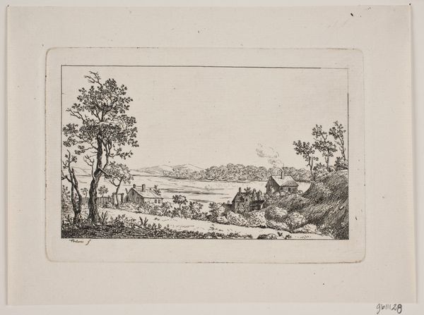 Editor: This drawing, "Landschap tussen Arnhem en Zutphen bij het Huis Middagten" from 1802, is rendered in graphite and etching. It’s lovely! It has a subdued and quiet feeling. What do you see in this piece? Curator: First, observe how the composition is meticulously structured. The artist uses the large tree on the left as a repoussoir, guiding our eye into the landscape. The foreground, middle ground, and background are clearly delineated through changes in texture and tonal value. How does this ordered layering affect your reading of the scene? Editor: It does make the scene feel very stable and well-balanced, even if the forms themselves are organic. But what about the relationship between the detailed foreground and the hazy background? Curator: Note the contrast between the detailed rendering of the tree and the blurred, almost atmospheric perspective used for the distant plains. This dichotomy establishes spatial depth and creates visual interest, doesn’t it? Consider the use of line and tone. What patterns do you see? Editor: The varying line weights seem to define the forms in the foreground while the tone flattens out toward the background. It almost creates a sense of air between the planes of the landscape. Curator: Precisely. This deliberate manipulation of artistic elements reinforces the idealized and picturesque qualities sought after during the Romantic era. It really encapsulates formal principles as compositional harmony and depth, don't you think? Editor: I see how examining the artistic elements like line, tone, and composition reveals more about the intended feeling of the landscape. Thank you! Curator: Indeed. By analyzing the formal structures, we can better grasp the essence of the artist’s vision.