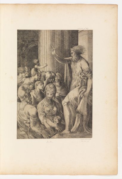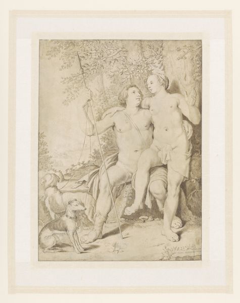 Curator: Looking at "Hercules en Iole", an engraving now residing at the Rijksmuseum, what leaps out at you? Editor: Honestly? A slightly awkward, though oddly captivating, theatricality. It's like stumbling upon a private dress rehearsal for a play where someone forgot their costume. Curator: The print, dating sometime between 1570 and 1659, uses intaglio techniques to depict a moment laden with symbolic inversion. Hercules, typically the epitome of masculine strength, is subjugated, while Iole is…well, rather robust. Editor: Subjugated is one way to put it. He’s practically conducting the orchestra of his own emasculation with that tambourine. The exaggerated musculature coupled with the silly little instrument—it's poking fun, right? Curator: Precisely! Remember, this work reflects the Mannerist style, which often employed deliberate distortion and exaggeration to create visual drama and intellectual playfulness. The heroic nude, a classical motif, is subverted. Note the deliberate contrapposto. Editor: And Iole! She’s like a parody of idealized beauty—earthy, unapologetic, almost challenging the viewer. The narrative reads: powerful hero brought low by love, reduced to this comical state by… well, desire. Curator: The artist subtly alludes to the original myth, the exchange of clothes where Hercules, dressed in women’s attire, performed domestic tasks for Iole. Symbols of power are swapped for instruments of servitude and eros. It serves as an allegory of the potentially corrupting power of desire. Editor: A bawdy bedroom farce immortalized in meticulous engraving, perhaps? Despite the heavy symbolism, I'm mostly struck by its weird humor. Curator: Perhaps the image also reminds us of our own vulnerability to seemingly harmless pleasures, our tendency to relinquish control in pursuit of comfort and affection. Editor: Right you are! Even demigods have their soft spots, their moments of comedic surrender. What a revelation! Curator: It certainly invites consideration of classical myths through an unexpected and somewhat irreverent lens, blurring the lines between strength and weakness.