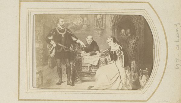 Hendrik D. Jzn Sluyter created this print called 'Karel V van Habsburg (Duits keizer en koning van Spanje) bij het graf van Willem Beukelszoon in 1556' at an unknown date. The composition emphasizes a central gathering of figures within a church-like setting, achieved through a meticulous arrangement of light and shadow. Look at how the artist used finely etched lines to delineate each figure and architectural detail. This careful craftsmanship invites us to consider the narrative and the symbolic space it occupies. Sluyter's print functions as a tableau, where each character plays a role in a larger historical commentary. The contrast between the somber attire of the clergyman and the ornate garments of the royals may suggest power dynamics or societal values. Observe how the vertical lines of the architecture and the directional gazes of the figures converge on the tomb, underscoring themes of memory and legacy. This composition isn't just aesthetically pleasing; it’s a calculated arrangement of signs, inviting us to unpack the layers of history and meaning embedded within.