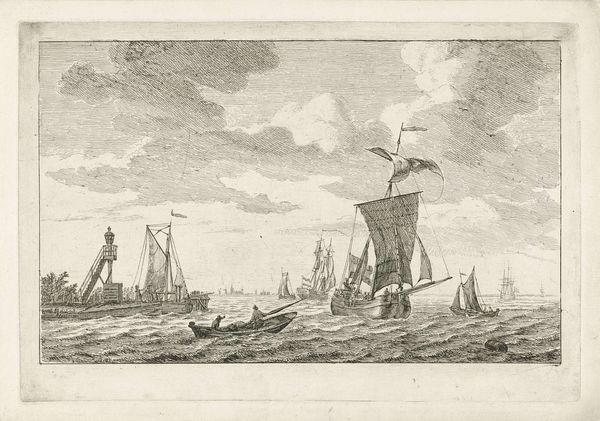 Curator: So, here we have a rather diminutive print, "Scene of Three Large Ships and Several Rowboats Full of Men," by François Collignon, housed here at Harvard. First thoughts? Editor: Oh, wow, it's incredibly detailed for its size! It feels like a bustling port scene, but there's a strange stillness too, like a freeze-frame. Curator: Collignon really captures the dynamism through the etching. You get a sense of movement despite the static medium. The composition, with the ships receding into the background, gives a feeling of depth. Editor: Yes, and the contrast is fascinating! The large ships, symbols of power and commerce, dwarfed by the tiny figures scrambling in rowboats. It's a bit unsettling, really. Curator: Perhaps a commentary on the individual's place within the grand scheme of maritime trade? One ponders. Editor: Makes one think about the vulnerability of humanity at sea. It’s almost as if the artist is reminding us of our insignificance against the backdrop of the ocean. Curator: A potent little piece. Editor: Indeed! A tiny world teeming with questions.