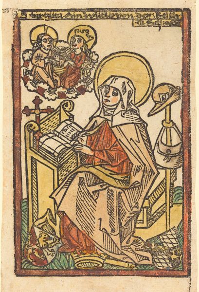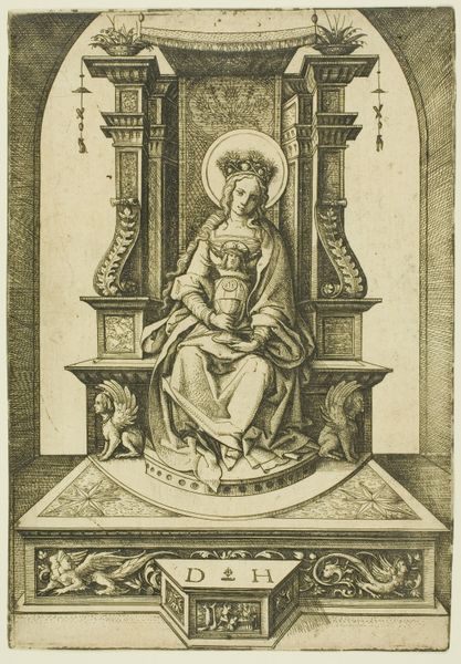 Editor: This is "The Apostle Simon and His Martyrdom" by Allaert Claesz., made sometime between 1510 and 1530. It’s a pen drawing, engraving, or a print – it's hard to tell which, exactly – at the Rijksmuseum. It feels very symbolic, but also gruesome with that scene at the top… What do you see in this piece? Curator: I see layers of meaning embedded within a visual framework familiar to its early 16th-century audience. Note the saw, Simon’s attribute, marking him as a figure of faith but also signaling his brutal end. Consider how that scene of martyrdom is framed, elevated almost like a sacred emblem. It's not just depicting an event, but encapsulating an entire doctrine. Editor: So the tool of martyrdom becomes almost like a… badge? Does that affect how viewers might have understood violence in that time? Curator: Precisely! Think of religious iconography as a language. Certain symbols held immense power, capable of communicating complex ideas about salvation, sacrifice, and divine justice. This saw isn’t just an instrument of torture; it’s a potent reminder of unwavering faith, understood in light of eternity. The surrounding ornamentation with the stylized flowers enhances the drawing, almost sanctifies the depiction of brutality, inviting contemplation rather than repulsion. Do you see how it speaks to memory? Editor: I see how it’s supposed to teach, remind, maybe even inspire. The shapes surrounding the central figure also suggest those elements – that’s something I didn’t catch at first. Curator: Exactly. This is a testament to how artists use symbols to shape not just how we see, but how we remember, constructing a powerful narrative. Editor: I never considered how an object, like the saw, could carry so much weight, beyond just being itself. Curator: It transforms how we experience the story of Saint Simon and what sacrifice really means.