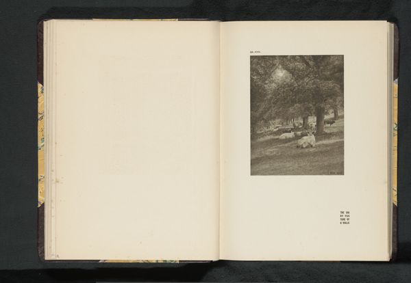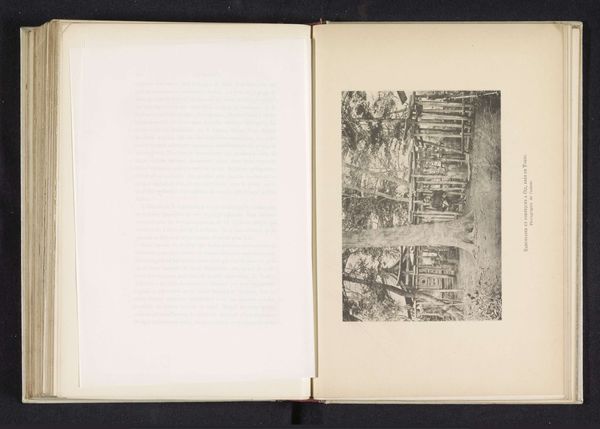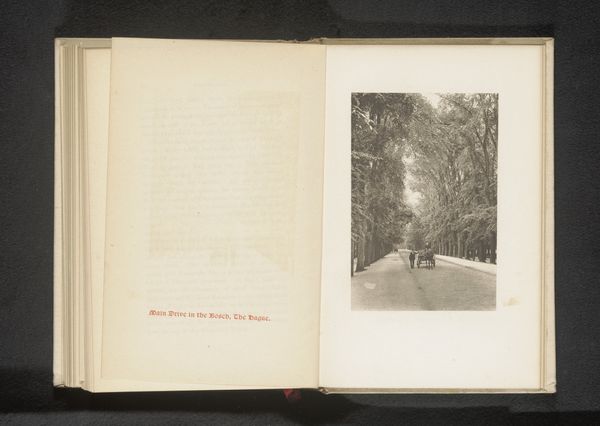 Curator: We’re looking at "Gezicht op de Nieuwegracht te Utrecht," a print from before 1894, displayed as part of an open sketchbook. The opposing page bears a title: “The New Canal, Utrecht." Editor: It's a serene scene. The photographic print has soft gray tones; its placement feels deliberately off-center on the right page, drawing immediate focus. Curator: Yes, the materiality here is quite evocative. The aged paper suggests both the passage of time and the active life of this sketchbook. We see evidence of a physical, handcrafted object meant for personal documentation. This pre-dates mass-produced, high-resolution photography. Editor: Indeed. It speaks to a period where images held a different weight. The canal itself would've served not just as a waterway but as a locus of social interaction and economic activity. Who lived along its banks? How did their lives intersect with this seemingly peaceful view? The image is an unedited peek into everyday urban life in Utrecht, one absent of a purely commercial intent. Curator: That's a crucial point. There's also the process of creating and reproducing this print. From preparing the chemicals, transferring the image to the paper, developing the print, and meticulously integrating into the layout of this book. How do these physical interventions impact our interpretation of the landscape? Editor: I see this cityscape as more than an isolated scene; it embodies ideas about urban development and societal values prevalent at the time. Who had the leisure to create this sketchbook? What values are promoted or elided through its presentation and context? Curator: Precisely. By emphasizing these aspects, we avoid a romanticized view of art, recognizing the hands that made it possible, both visible and invisible. Editor: Thinking about it more critically enriches our comprehension, turning this sketchbook page into a vibrant historical record. Curator: Agreed, acknowledging its multifaceted construction gives agency back to the art itself.