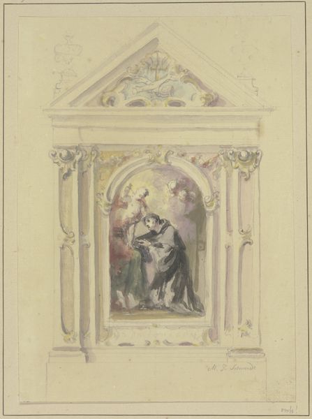 Editor: So, here we have Charles Onghena's 1842 ink and etching on paper, "Adoration of Mary and Christ." There's such delicate detail, and it's all encased in this floral border, which gives it a devotional feel, like a page from an illuminated manuscript. What jumps out at you when you look at this, a little devotional image with Mary enthroned? Curator: Well, I think you’ve hit on something really key there: "devotional". This piece feels like stepping into a dream, doesn’t it? I find my gaze drifting amongst the kneeling figures to that serene central image, Mary offering something precious. I get lost wondering what her thoughts are. The fine line work almost obscures details. Almost as if the picture might vanish with a thought… does it speak to you? Editor: I see it, a disappearing devotion perhaps. There is something fading here! The composition, while classically staged, feels almost ephemeral. Do you think that feeling relates to its creation as an etching? Curator: Perhaps the etching does enhance that dreamlike quality, wouldn’t you say? As it exists here we are really engaging with a copy of something much grander, so perhaps that is a piece of the remove that helps us to almost engage with it rather than be engulfed by its intense faith and feeling. Does this resonate? Editor: Absolutely. Thinking of it as a copy softens the "religiousness" and heightens the "artfulness" for me. Thanks, that’s a fascinating angle. I appreciate how the medium informs our modern perception. Curator: It works like a distant melody heard just as you awake. I agree—thinking about its materiality truly does unlock another chamber of meaning.
