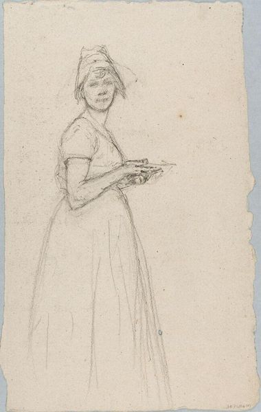 Curator: This delicate sketch, part of the British School's collection at the Tate, depicts a woman with hands on her hips, adorned with an elaborate headpiece. Editor: My first impression is one of confident defiance, though the sketchy lines suggest a fleeting moment captured. Curator: Indeed. The pose, with hands assertively placed, suggests a self-assuredness, perhaps signaling her status within a certain social stratum. That headpiece certainly makes a statement. Editor: It's a study in contrasts. The roughness of the charcoal against the presumed finery of her attire. What kind of labor was involved in acquiring those materials? Curator: A fascinating question. The visual language hints at power, perhaps even a matriarchal figure. It is interesting to see what one artist can communicate using so little material. Editor: Absolutely. It is a reminder that art, in all its forms, reflects the social fabric from which it emerges. Curator: A potent reminder of how we construct meaning through symbols. Editor: And of how material reality shapes those symbols.