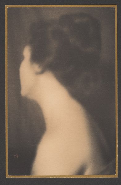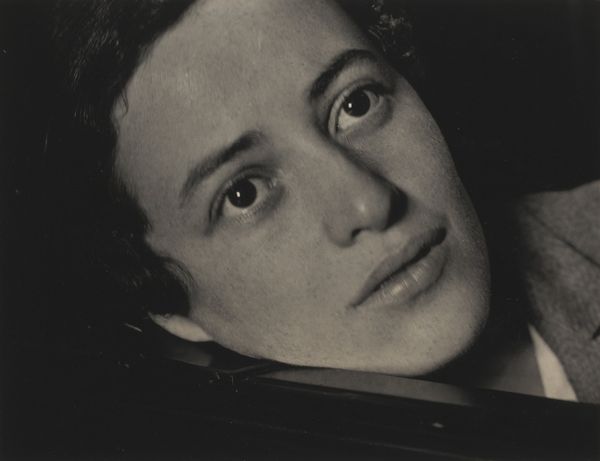 Curator: Alfred Stieglitz created this captivating portrait, "Eva Herrmann," around 1920 using a gelatin silver print. Editor: Striking. The delicate gradation of light gives it an ethereal, almost sculptural quality, like a marble bust emerging from darkness. There’s an arresting severity too; she almost seems stoic, or resigned. Curator: Right. It exemplifies the Pictorialist style, where photography mimics painting, using soft focus and carefully controlled tonal ranges to evoke emotion. Think about what it meant for a woman to have her image crafted in this manner during this period—the role of the male gaze and how the subject interacts or resists it. Editor: Certainly the hand of the artist in crafting the print itself becomes a kind of labor on the image. But there's also Herrmann’s contribution, her posing and performance within that encounter. I wonder about her agency. What part did she have in determining the final representation and in what way would this collaboration be material in itself? Curator: Those power dynamics are certainly at play. Pictorialism, as a movement, also aligns with modernism’s questioning of representation and its deep engagement with identity formation in a rapidly changing world. What can it tell us about evolving societal expectations surrounding femininity and how they may reflect the tensions related to art history and its contemporary theory, particularly related to intersectional narratives that are specific to gender and even perhaps to race at that time. Editor: And thinking about materiality—the gelatin silver print allows for a rich tonality, creating a velvety surface, but how did Stieglitz use these techniques in his darkroom? What manipulations did the print undergo to yield this particular vision? How does Stieglitz work change given the economic climate he created? Curator: Those technological aspects absolutely shape our perception, framing questions regarding how artistic interpretation and social narratives affect us today. I consider this piece to be quite impactful even now, opening new and dynamic viewpoints that create dialog across generations. Editor: Agreed. Exploring it, from process to power structures, has only deepened my understanding.
