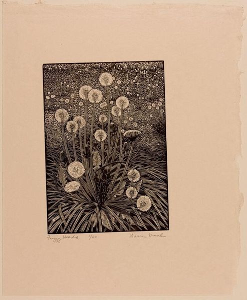Editor: Here we have "Blomsterbukett," a woodcut print by Siri Magnus-Lagercrantz, made sometime between 1930 and 1947. I’m struck by its graphic quality and the stark contrast of black and white. What do you see in this piece? Curator: Indeed. One can see how the composition uses line and form to achieve its effect. Note the tension between the organic, almost chaotic arrangement of the flowers and the rigid geometric shapes of the vase, the table and frame. The high contrast exaggerates the textural qualities inherent to the woodcut medium, adding another layer of complexity. Editor: It feels like there is more emphasis on texture and lines than realistic shapes. Can you expand on this? Curator: Observe the absence of color. The image asks us to examine value, shape and the negative space between forms. The artist appears to prioritize the flatness of the picture plane and to draw attention to the graphic qualities of the print, instead of creating a three-dimensional illusion. Do you notice the interplay between the organic forms and the hard lines, and the contrast this tension creates within the overall composition? Editor: I do see the tension between organic shapes and hard lines now. So the lack of color isn’t a limitation, but a choice that emphasizes form and texture? Curator: Precisely. The reduction to black and white strengthens the emphasis on the essential, structural components of the image. Editor: This piece taught me to look at form and composition rather than relying on colour alone. Curator: Agreed. It's a rewarding reminder of the visual strength achievable through formal simplicity.