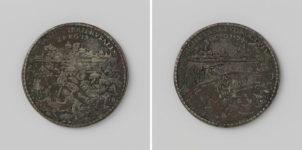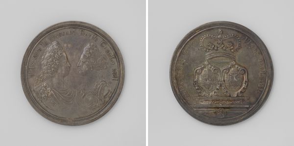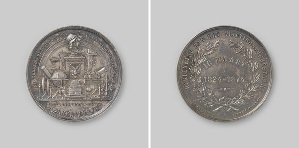 Curator: This piece is a medal presented to H.J. Wilke by the Arnhem Department of the Geldersche Agricultural Society, in recognition of his conifer collection. It likely dates from between 1846 and 1855. Editor: It has such a weighty, almost solemn presence, doesn't it? The silver finish lends it an air of seriousness, despite its small size. It makes me think about the land. Curator: It does speak to a deep connection with the land. Awarding medals was common practice for agricultural societies who were trying to promote best practice through recognizing contributions in local communities. We are really talking about 19th century agricultural politics here. Editor: The imagery underscores that. Notice the prominence of the agricultural plow, it’s a recurring symbol throughout history linked with human dominion over nature. It reminds me of ancient agricultural deities. Curator: And the coat of arms! With its placement framed by the oak leaves, a familiar symbol of strength and endurance, this medallion emphasizes themes of both civic pride and agricultural productivity. It served a purpose far beyond simple acknowledgment. Editor: Exactly! It visualizes value systems. The object itself becomes an icon, an artifact imbued with communal aspiration. Even today it invites viewers to engage with 19th-century ideas of landscape, cultivation and progress. Curator: What’s interesting here is the choice of conifer trees for the collection because traditionally conifer's don't grow as well here. But with growing global trade during that period and the popular idea of progress this became a popular venture to push the boundaries of the landscape. Editor: The medal seems to crystallize so many ideas, a mini-universe contained within its circular form. Curator: Indeed. Medals like this illuminate the historical connection between agricultural societies, individual ambition, and public reward within the region of Gelderland. Editor: It certainly prompts a deeper appreciation of the values they represented and the role objects play in encoding shared cultural aspirations.