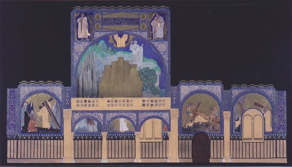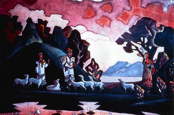 Nicholas Roerich painted "Glory to the Hero," in an unknown year, using tempera on canvas. The artwork is divided into two distinct visual spaces: an illuminated interior on the left, and a stained glass window on the right, both framed by arches. This contrast invites us to reflect on the interplay between light and shadow, reality and representation. Roerich's approach to form is evident in his simplification of shapes. The sharp angles of the architectural details on the left lead the eye towards the window, which is a complex geometric interplay of coloured shapes. These create an image of a heroic figure, possibly Saint George, slaying a dragon. This juxtaposition highlights Roerich’s interest in symbolic representation and structural clarity. The use of contrasting light, color, and geometric patterns, invites us to decode the semiotic systems at play. By destabilizing fixed meanings, Roerich invites us to contemplate the relationship between material existence and the world of ideas. His composition is not merely aesthetic, but an engagement with cultural and philosophical discourses that continue to evolve with each interpretation.
