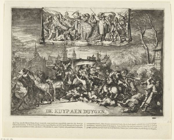 Curator: Here we have Abraham Allard’s engraving, "Balans van Oorlog en Vrede, 1709," dating between 1674 and 1709, found at the Rijksmuseum. It’s dense. Editor: Extremely so. A first impression gives a feeling of…claustrophobia. The tightly packed figures, the stark black and white of the engraving itself. It’s visually overwhelming, almost oppressive. Curator: That density is carefully orchestrated. The composition is constructed around the central motif of a scale, teetering precariously. One side weighted by figures symbolizing war and the other depicting peace. Note the cityscapes looming in the backgrounds, juxtaposing scenes of destruction with prosperous life. Editor: I'm drawn to the material reality of its production. Engraving demands precision, rigorous control of line and tone. It’s a demanding labor and the finished piece becomes a vehicle to disseminate a specific political view of the time. Curator: Precisely. The allegorical figures, each with their detailed attributes, aren’t just aesthetic choices. They’re signifiers within a larger symbolic framework—the lion representing courage, the olive branch denoting peace, each element contributing to a narrative about geopolitical balance. Editor: And yet, consider the act of distributing printed material at that scale. Think about its reception; the social settings in which this image would circulate. The material tells a story about early propaganda. What sort of consumption habits and economic relationships are involved in mass printing in the 18th century? Curator: A relevant consideration! For me, the composition's real success is how Allard balances complex symbolism with immediate visual impact. He uses linear perspective and dramatic chiaroscuro effects to draw our eye directly to the pivotal moment of precarious equilibrium, using a rather compelling visual rhetoric. Editor: It does capture the unease inherent in any period of shifting power. For me it becomes an artifact loaded with the materiality of early print propaganda and as an economic driver, more so than just an artistic message. Curator: Allard's use of emblematic language offers an illuminating lens through which we may understand the Baroque aesthetic as a carefully structured semiotic system. Editor: Agreed. And as such, his print now also invites discussions of production, labour, and distribution in that period of increasing conflict.