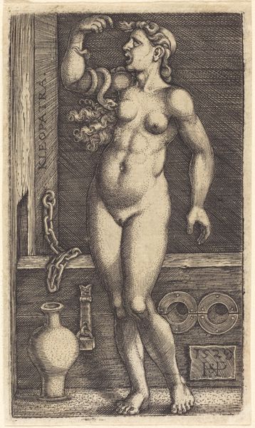 Léon Davent created this engraving, *Standing Nude Woman*, sometime in the mid-16th century. At this time, the female nude was a way for male artists to show off their skill and imagination, often drawing inspiration from classical sculptures of goddesses like Venus. However, Davent’s figure departs from idealized beauty standards: her form is fleshy and rendered with an interest in the particular rather than the ideal. She stands in a domestic interior, close to a draped chair. Her hand is raised to her neck in a gesture that seems less about alluring display and more about introspection. There’s a tension here – this is a nude, and yet she almost seems like she could be caught unawares in a moment of private reflection. Is this Davent's way of bringing a humanist perspective to the traditional nude, acknowledging the inner life of his subject, or is it another version of the male gaze? What do you think?