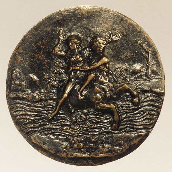Curator: Before you is a Mannerist bronze relief known as "Mars Battling the Constellation Centaurus." It's attributed to Nicolas Guinier and dates to before 1610. Editor: Wow, immediately I see something intense! The combat feels tight, constrained almost, like pent-up aggression in a coin-sized cosmos. Is that Mars, totally off-balance, ready to strike? Curator: Indeed. This relief presents Mars, Roman god of war, in dynamic conflict with Centaurus. What strikes me is how Guinier uses a historical lens to engage in debates about warfare's virtues within the socio-political context of his time. Editor: I am drawn to the musculature. Look at how it ripples, even constrained by this relief! The bronze adds a weight to it—an aura of permanence amidst the chaotic brawl. Does the "reverse" in the title imply there's a corresponding relief? What is this thing's backstory? Curator: Yes, there could very well be other companion pieces to this work. It might have served a purpose beyond mere decoration, as art became increasingly entangled with displays of power and knowledge. The dense imagery on such a small object surely sparked intense conversations and possibly revealed details about its owner’s cultural aspirations. Editor: Well, thinking about how it could become some rich person's source of culture points is far less appealing to me than its actual existence! This is something crafted with serious skill—and given a second glance, it does show incredible detail given its size. So perhaps it also shows the aspirations of its crafter? Curator: Possibly. That's definitely worth considering! But if you focus too closely on an artwork’s creator alone, you risk losing sight of the conditions within the art world that make a work like this desirable, its social function and impact on how war itself was viewed. Editor: All true. Well, no matter what the context may be, I still feel the dynamism; it’s like witnessing a micro-explosion caught mid-burst, the power practically leaps out, doesn't it? Curator: Absolutely, and hopefully these bursts of insight give everyone who has taken the time to explore this Mannerist masterpiece something interesting to consider! Editor: Indeed, and perhaps with these dueling thoughts on battle, Mars, and what motivated those who witnessed the artwork then, or even today, you are now able to craft a new dialogue with "Mars Battling the Constellation Centaurus" all your own.