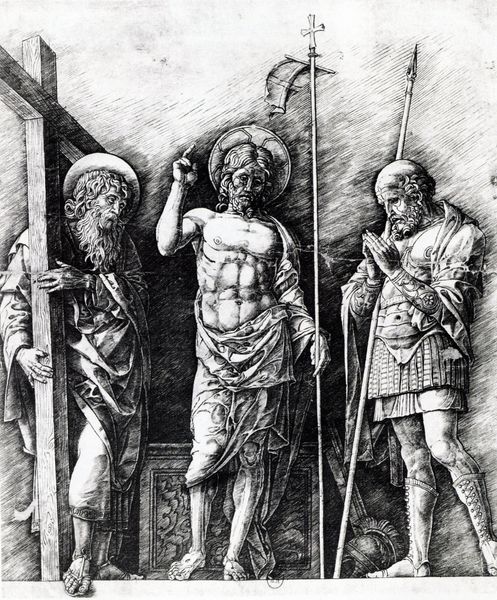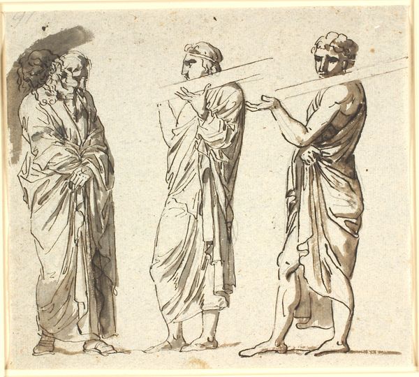 James Tissot created this watercolor, entitled Shem, Ham and Japheth, during a period of renewed interest in biblical themes in the late 19th century. This work offers a window into the complex intersection of religious narrative, cultural identity, and artistic interpretation of the time. As the sons of Noah, Shem, Ham, and Japheth are central figures in the biblical account of humanity's repopulation after the great flood. This image, however, isn't just a retelling of a familiar story, it reflects the social and cultural context of Tissot’s era. Look at how each figure is individualized through costume and pose, yet grouped together. What does it mean to depict these figures with such particularity, while also emphasizing their shared ancestry? How might this relate to contemporary ideas about race, lineage, and the construction of identity? As you consider these questions, allow yourself to connect with the emotional depth and cultural resonance embedded within this artwork.