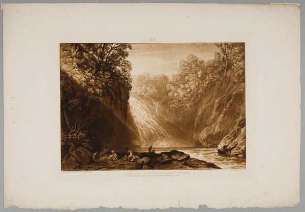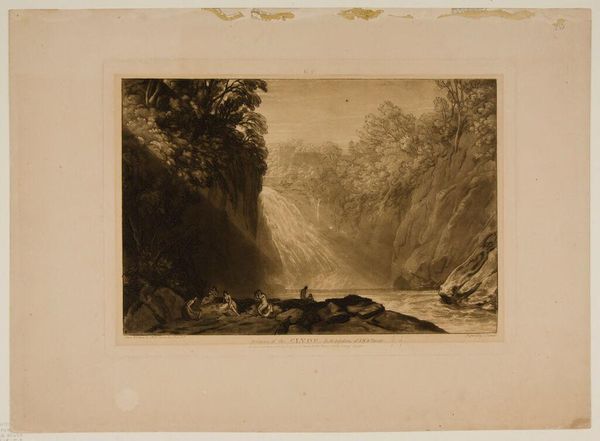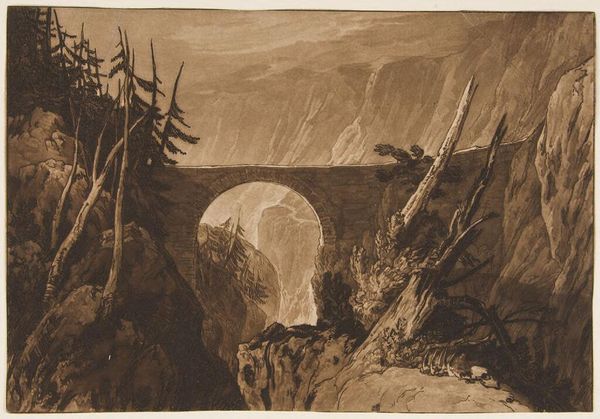 Editor: This is Charles Turner's "Little Devil's Bridge," a print of some kind. It's quite dramatic, almost theatrical. What do you see in this piece that I might be missing? Curator: The "Devil's Bridge" motif speaks to a fascination with the sublime, and a negotiation with danger and the unknown. Notice how the bridge becomes a symbol of human endeavor against the overwhelming forces of nature. Does it feel more romantic or threatening to you? Editor: Definitely both! There's a sense of adventure, but also a hint of something sinister lurking in the shadows. Curator: Precisely. And the turbulent river below? It's a classic symbol of the chaotic, subconscious. It's not simply a landscape, but a psychological space. Editor: I see it now. It's much more than just a bridge. Thanks! Curator: Indeed. The enduring power of these images lies in their capacity to resonate with our deepest fears and aspirations.