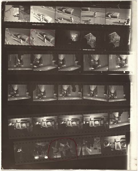 Curator: Here we have "Postcard: Artists' Portraits" by General Idea, a photograph where light and shadow create a palpable tension. What’s your first take? Editor: It feels like a scene from a Cold War thriller, all stark contrasts and unsettling geometries. Curator: Precisely. Observe the composition, how the subjects are positioned, and the array of objects – a telephone, technical drawings, and even a saw blade motif. Editor: A saw blade? That’s intense! It's like a visual metaphor for cutting through something, maybe through artistic conventions themselves? Curator: An astute reading! General Idea often employed such loaded symbols to critique and deconstruct cultural narratives. Editor: This piece definitely invites a lot of questions. So much for a simple portrait. Curator: Indeed. It's a dense, layered work that keeps revealing new angles. Editor: I'm going to be thinking about that saw blade for days.