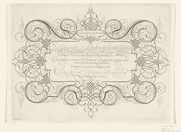 Curator: Let's turn our attention to this intricate piece titled "Calligraphic Design for a Title Print" by Jan van de Velde I, created around 1605. It's a fascinating example of Northern Renaissance graphic art, executed in ink. Editor: Wow, it looks like a spider web spun by a very meticulous, and perhaps slightly obsessive, arachnid! The delicacy of the lines is quite mesmerizing. It's all form and fancy, really striking. Curator: Indeed. The focus on pure line, a hallmark of the era, is evident. Consider the socio-economic context; calligraphy wasn't merely decorative but crucial for legal documents, religious texts, and personal correspondence. Skills in producing decorative prints such as this one signalled mastery of letterpress and printing industries which, since their emergence in the mid-15th century, had redefined production and readership. Editor: It does feel incredibly purposeful. It makes you think about the patience involved. I mean, each swirl and flourish perfectly placed and balanced—the labor involved must have been tremendous! Does knowing about this work’s origin change how we should be seeing type-face in today's publishing world? I can just feel this print wanting to challenge my perspective. Curator: Absolutely! This wasn't simply about aesthetic appeal; it also showcases an expert's mastery of penmanship, effectively communicating not only the meaning of words but the very act of skillful creation. Look at how line becomes form and texture. Even geometric shapes enter to establish certain kinds of frames. It emphasizes not only functional literacy and also haptic literacy for future readers who might interact with this page. Editor: I get what you mean. You're right to imply a challenge between form and functionality here; the legibility certainly is subordinate to artistry here. The swirls and curves—while visually appealing—tend to obfuscate meaning for sure! I just feel like there's a deeper meaning here that could challenge our present sensibilities as both artists and viewers... Perhaps I might try something new. Curator: A perfect way to approach Van de Velde's hand. From production methods to artistry, I really get your perspective and I agree. Thanks. Editor: You too, bye.