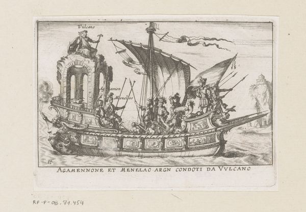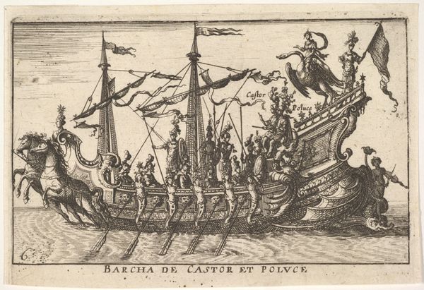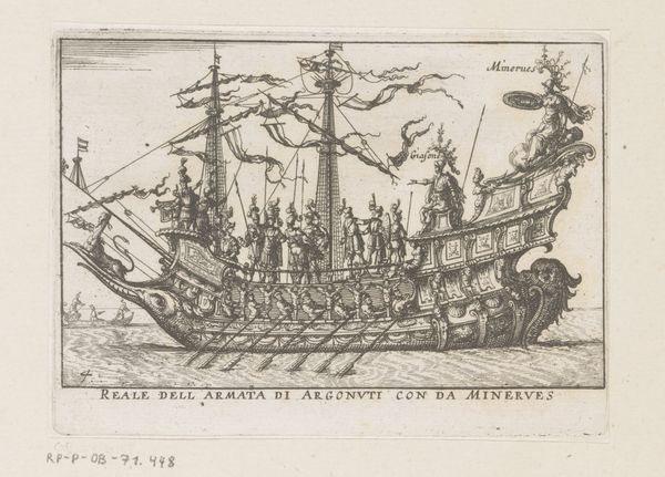Curator: This print, titled "Ship with Argonauts and Tethys", dates to about 1635 and we attribute it to an anonymous artist. It's an engraving, and it’s currently held here at the Rijksmuseum. Editor: It has a strange sense of regal power, even for such a small engraving. The composition, all lines and precise detail, almost feels overwhelming with all these figures. I see gods and soldiers together on this vessel. What do you make of it? Curator: Given that the print portrays a boat laden with classical figures, it seems a likely subject would be to interrogate how concepts of leadership, class, and divinity intertwine and justify sociopolitical hierarchies during that era. Who had access to these stories and visual representations? How did this artwork justify those power structures to different audiences? Editor: Well, considering its context within the rise of Baroque style, it makes sense. I think of absolutist rule during that time and all the aristocratic associations that come with the idea. I see classicism used here as a means of claiming authority, right? A way of legitimizing through inherited traditions. Curator: Absolutely. Tethys herself— a Titan goddess of the primal font of fresh water— is right there on the stern! The engraver seems intent on reminding the viewer that these "leaders" have divine mandate, a particularly effective mode of social persuasion. I'm very curious what message its circulation and reception generated. Editor: Also look at how crowded that boat is! Each rower rendered in detail, emphasizing this laboring class. Do you think there is perhaps something within that representation that gives insight into the political structures in place that upheld all of this class-based society? I wonder how contemporary eyes saw that dynamic playing out. Curator: Those are excellent questions, and precisely what the artwork makes me consider! These visual documents allow for critical engagement with the past and prompt discussion around issues that still persist. Editor: Yes, how artistic patronage and even the materials of the artwork relate to wider power relations. I'm thankful it offers these opportunities to reflect on societal complexities.