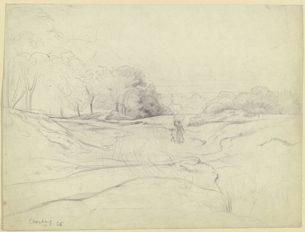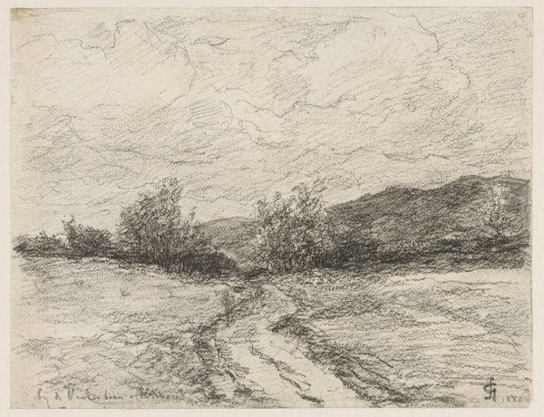 Editor: This is Fritz Syberg's "Den haarde Vinter," created in 1928 using graphite. It's a stark winter landscape that evokes such a sense of cold desolation. What do you see when you look at this piece? Curator: Immediately, my eye is drawn to the linear quality of the drawing. The artist masterfully uses hatching and cross-hatching to define form and texture, creating a nuanced interplay of light and shadow. Consider how the horizon line is almost a relentless straight, and the strategic variation in line weight. Notice also the composition and economy of the design of the piece, creating visual interest in this harsh, colorless vista. What do you observe in the foreground? Editor: I see the dense tangle of a bare tree or bush. Its form seems so much darker and more detailed than anything else. Why do you think Syberg chose that level of stark contrast? Curator: Perhaps it is acting as a visual anchor but also creating depth with the use of that very intricate detail against the sweeping plains and simplified shapes that recede into the distance. This contrast emphasizes the desolate vastness while drawing our attention to the minute details within it, don't you think? Note how even the thin sliver of a crescent moon punctuates the drawing’s minimalist upper register. It’s not about direct representation; it's about the relationships between the forms and marks. Editor: So, it’s less about the literal scene and more about how all these compositional elements interact to create a feeling. It’s almost like the moon is both physically in the distance, but also pushing against it. Curator: Precisely. The relationships of form and tone, the juxtaposition of the natural and stylized. These all contribute to a successful image. Editor: That really shifted how I see it! I was stuck on the "what" and not the "how." Thanks. Curator: My pleasure.