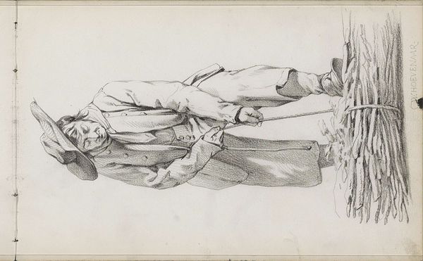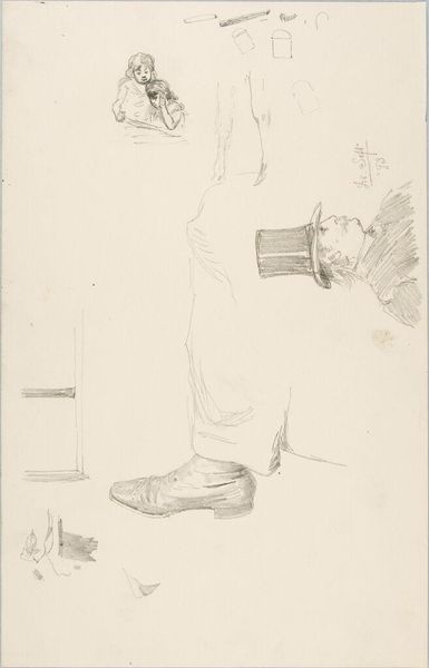 Curator: This is "Sketches of Dressed Human Body," a drawing by William Valentine Schevill, currently held at the Harvard Art Museums. It captures, with swift strokes, details of clothing and posture. Editor: The immediacy is striking. It feels like a momentary glimpse, a fragment of a figure caught mid-stride. The paper itself seems almost ephemeral. Curator: The cane and the tailored sleeve, though, suggest a certain formality, a social standing. The image evokes a sense of memory, of piecing together a vanished presence. Editor: But look at the way the lines form the fabric, the shading that gives shape to the leg. There's a clear focus on the material, the way clothes define and confine the body. Curator: Perhaps Schevill was interested in more than mere representation. It seems he was trying to capture the fleeting feeling of a person, the impression they leave behind. Editor: Ultimately, it's about the act of seeing, the recording of fleeting moments through a very specific process of hand and material. It’s quite beautiful.