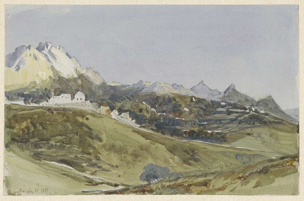 Curator: Here we have "Loch Chon" by David Young Cameron. It's a plein-air watercolor and ink drawing depicting a Scottish landscape. What strikes you about it? Editor: It feels very… fragile. The washes of watercolor give it a delicate, almost ephemeral quality, like a fleeting memory. I am curious, though, how it qualifies as plein-air. Curator: While Cameron is not typically associated with that approach, the loose handling of the watercolor medium certainly captures an immediacy often found in painting done outdoors, engaging directly with the motif. The Scottish landscape itself, often romanticized, takes on a new dimension in this more informal depiction. Editor: I find myself wondering about the availability of pigments in that landscape and how they influence the colour palette he used. Those muted browns and pinks suggest local earth pigments perhaps? How would this watercolor differ if Cameron worked somewhere else? What materials did he consciously leave out or favour? Curator: Interesting point! The muted tones certainly echo the colors of the Scottish Highlands. Also, you may be on to something about Cameron's material choices, even if unintentional. Consider the role of institutions and public perception in establishing that his landscapes are more about 'mood' and 'national identity' and less about close replications of actual places through scientific applications of specific materials. What do you make of that? Editor: That reading places a kind of pressure on the work itself. Looking at how lightly Cameron touched the paper – the visible brushstrokes – I get a strong sense of his own physical engagement. There’s something profoundly corporeal about that which makes it unique regardless of context and discourse. Curator: A really valuable reminder about the physicality involved in art production! I appreciate you bringing that dimension into our view of "Loch Chon." Editor: And I think looking into that type of painting tradition contextualises and celebrates Cameron’s labor here in ways that just seeing this image as “Scotland” fails to address.