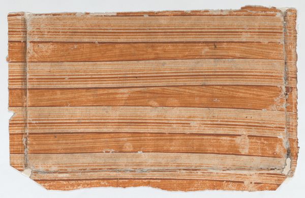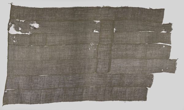 Curator: Before us hangs "Flag," a textile work created before 1822 by an anonymous artist. Its very form invites consideration of texture and composition. Editor: There's an austerity to it. It speaks of exposure and time, of natural processes left to run their course. I can almost smell the earth it came from. Curator: Indeed. Observe how the artist—or craftsperson, if you prefer—employs the weft and warp to generate a spatial effect, pushing against a purely flat reading of the surface. Note also the significance of the seemingly arbitrary placement of these abrasions. Editor: But these "abrasions," as you term them, these losses of material are integral, aren’t they? It’s not about a composition in the traditional sense. The degradation is the composition, a collaboration with entropy, pointing to labor and its consequences over time. How many hands and what purposes shaped this textile and led to its ultimate disrepair? Curator: One could argue the missing parts generate absence as a powerful formal tool; that negative space reshapes how we perceive the solid ground. It evokes concepts explored later in arte povera, that any mark transforms the raw object into art. The materiality is merely the catalyst. Editor: If we strip away all consideration of context, of who made this, what materials and techniques did they use and how were these accessed? Reducing it to mere shapes is a distortion. This isn't about art for art’s sake. Curator: But within this, its starkness also lies its aesthetic force, its compositional tension created between pattern, absence, color, and the implications of intentional visual action, a semiotic narrative where this textile gains artistic significance. Editor: Maybe what truly speaks here, ultimately, is that, perhaps even accidentally, it still has some potency to compel dialogue across our very different orientations toward art, which itself says something, doesn’t it? Curator: Indeed, the discourse and interpretations form the work of art anew with each examination, just as each warp informs the weave of time's artistic interventions on textiles.