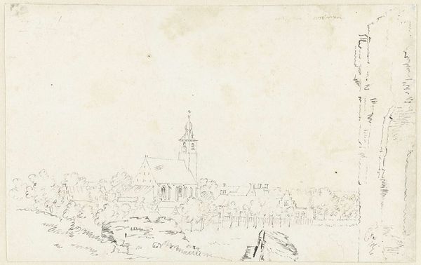 Editor: This is Jan Peeters's "Gezicht op Vitry le François," created between 1654 and 1656, using pencil. It's a cityscape drawing held at the Rijksmuseum. The scene feels so delicate and ephemeral. What do you make of its composition? Curator: It’s the rigorous execution of line and form which interests me. Observe how Peeters has created depth using tonal variation in the pencil strokes alone. See how the fortifications in the foreground, rendered with darker, more confident lines, advance towards us, while the buildings in the background retreat through a subtle lessening of contrast. Editor: That's a fantastic point about the line work creating depth! But doesn’t the subject also play a role? Curator: Of course, representation is also essential. The meticulous detail with which he captures the architecture reflects an intense engagement with its geometrical qualities and relationship between its components. But it’s not just about what is depicted, it's how the linear precision gives way to looser sketches and hatching that define volume. Consider also how the use of negative space further accentuates the details of the structure, like highlighting through selective articulation. Editor: It's fascinating how much information Peeters conveys with just pencil strokes and variations in shading. Curator: Precisely. Peeters achieves extraordinary control of a seemingly modest medium and explores structure itself, extracting from simple form an impactful statement. Did you find this discussion valuable? Editor: Yes! I came to see this as just a light sketch but now I really understand how the details give this drawing such impact. Thanks so much for sharing your perspective.