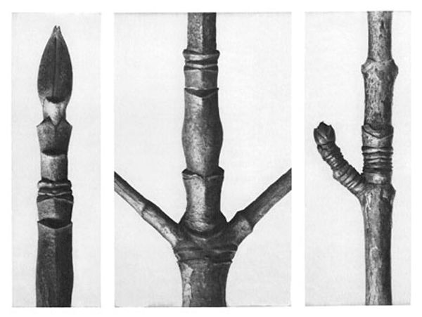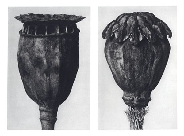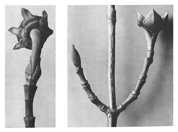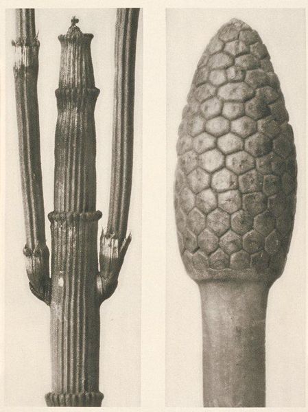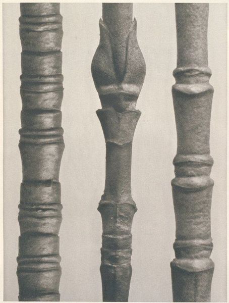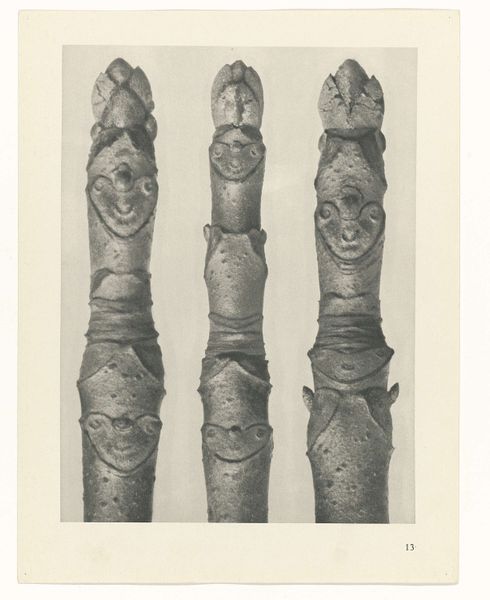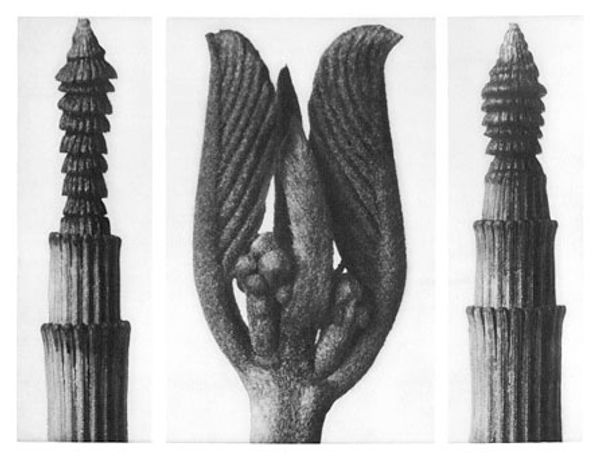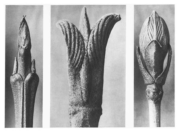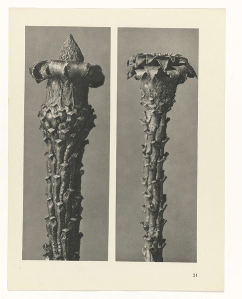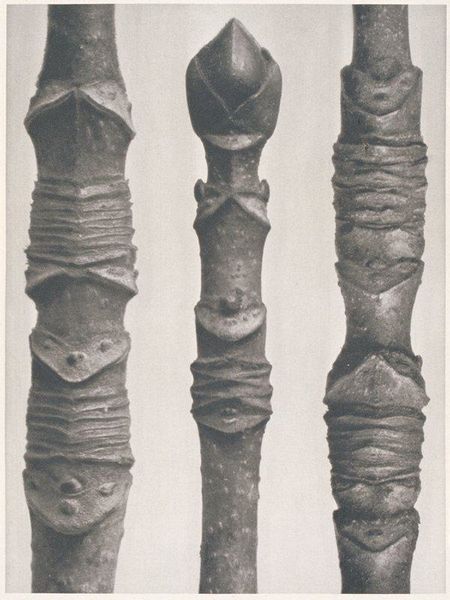 Editor: Here we have Karl Blossfeldt’s, "Art Forms in Nature 9," from 1928. It's a gelatin silver print, showcasing three different plant buds in striking detail. They feel almost like sculptures, isolated against the neutral background. How do you interpret this work? Curator: I see these magnified plant forms as echoing primal symbols, drawing on the deep-seated human impulse to find patterns and meaning in the natural world. Think about the persistent symbolism of the seed, the bud, representing potential, the generative power of life itself. Editor: So, Blossfeldt is tapping into something ancient? Curator: Absolutely. The sharp focus and stark presentation reminds me of scientific illustration, aiming for objective truth, yet they inadvertently evoke a sense of wonder and the sublime. Do you notice the geometric precision? It mirrors the universal language of form we see repeated throughout different cultures. Consider mandalas, architectural blueprints, the recurring patterns reflecting underlying order and the human desire to capture that order. Editor: It's almost like he's turning science into sacred geometry. The buds are so still, yet they’re about to burst with life. Curator: Precisely. It’s the moment of anticipation. That moment carries so much weight. By isolating these details, Blossfeldt reminds us that the world’s most transformative moments often happen in quiet, hidden spaces. Editor: I never would have thought of that myself! I’ll definitely be spending more time considering that generative pause. Curator: I'm delighted to hear it; noticing those liminal spaces can give us a greater sensitivity to the flow of existence itself.