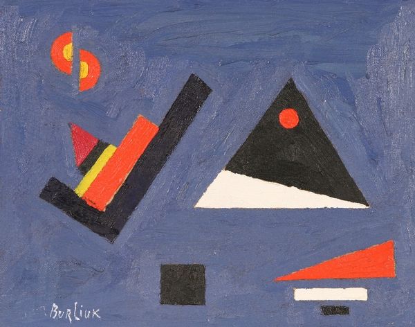 Editor: This is Amédée Ozenfant’s "Synthèse," an oil painting from the early 20th century. It strikes me as a bold experiment in form, with its sharp geometric shapes juxtaposed against the softer, more ambiguous forms below. What elements of composition do you find most compelling? Curator: Immediately, the tension between the rigid triangular planes in the upper register, rendered in a somewhat industrial palette of green, red, and blue, and the nebulous cluster of circular forms at the base demands our attention. Ozenfant seems to be deliberately investigating the interplay between clearly defined structure and amorphous shape. Notice how the texture shifts within these planes. Editor: Yes, the triangles are quite smooth, while the dark area seems almost textured. Curator: Precisely. This juxtaposition invites semiotic inquiry: what systems of meaning are built via geometry, color, and texture? I am curious about the negative space surrounding the circles. Note how these dark fields both separate and connect these visual elements, contributing to a sense of depth despite the two-dimensional surface. Also, observe how the circular forms echo one another across the visual plane. It creates a compositional call-and-response. Editor: So, by analyzing those formal aspects, we are able to approach an interpretation? Curator: Certainly. In focusing on form, we can infer much about the artist's intentions. This piece acts as an investigation into fundamental components of artmaking. Consider Ozenfant’s project: purging excess and exploring simple, lucid forms. How effective do you believe his use of stark, pure form communicates such ideals? Editor: I never thought of it that way before. Analyzing the pure forms clarifies Ozenfant’s artistic intention so well. Thanks! Curator: It has been enlightening to share the value of structural analysis as a path for artistic interpretations.