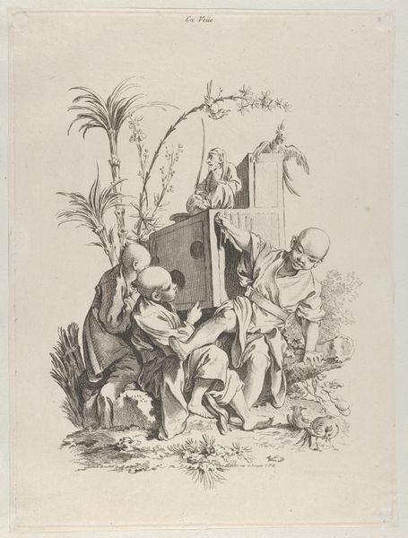 Editor: This is Gabriel Huquier’s "Two Women Leading a Child toward a Teapot on a Table near a Pond," dating to somewhere between 1737 and 1747. It's a delicate engraving, and I'm struck by how it presents this sort of idyllic scene, yet feels filtered through a distinctly European lens. What do you see in this piece? Curator: The engraving reverberates with the fashion for chinoiserie that gripped Europe in the 18th century. Beyond its surface appeal, though, it’s about the *idea* of China, a romanticized, imagined place. The image carries the weight of cultural appropriation. Editor: Appropriation? Curator: Note the specific choice of objects: the teapot, the clothing, and the exoticized flora. These weren't necessarily accurate representations of Chinese life, but symbols carefully selected to create a visual shorthand for "the Orient" for a European audience. Editor: So, it's not just a simple depiction of a family scene? Curator: Far from it. Ask yourself, what emotional responses do these symbols evoke, and what is the implication when Westerners extract them from their original context to apply them in unrelated settings and aesthetics? Editor: It makes me consider the power dynamics inherent in representation. The people become motifs. The picture is not about cultural exchange; it's a co-option. Curator: Precisely! It's about Europe defining itself *through* its imagined "Other." Now, does the experience change how you view the artwork? Editor: Absolutely! What at first seemed charming and picturesque now sparks much more thoughtful discussion about cultural perceptions and the stories we tell ourselves. Curator: That’s the beauty of delving into the symbolism; images become portals to understanding broader historical and cultural narratives.