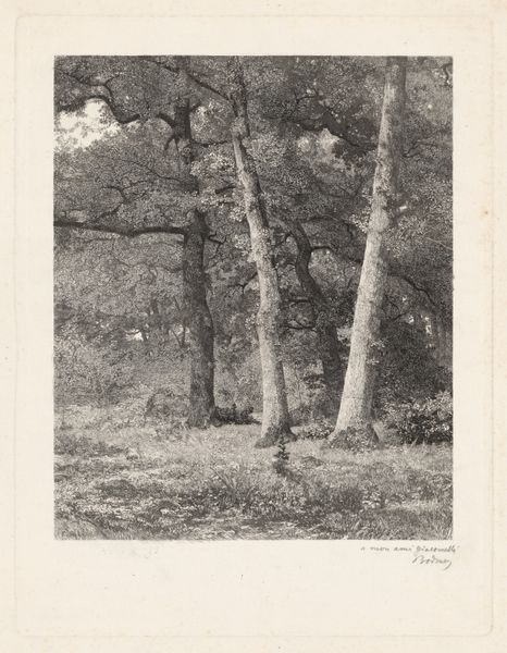 Editor: Here we have Karl Bodmer’s 1868 engraving, "Swarm of Birds Flying Through a Forest," housed in the Rijksmuseum. The density of the trees and the stark contrast between light and shadow create a somewhat unsettling mood, almost claustrophobic. What can you tell me about it? Curator: That "claustrophobic" feel is interesting. Consider this engraving appearing amidst the rise of industrialization. How might an image of a dense, natural, seemingly untouched forest act as a form of visual resistance? How might the Romantics receive a piece like this, versus the emerging Realist painters? Editor: Visual resistance, that's compelling. So, you're saying it might be making a statement about the environment being encroached upon? Curator: Precisely. Think about the context in which this work was made, during which you'd find rapid deforestation and urbanization. A detailed rendering like this reminds the viewer of what’s at stake: a connection to nature that's on the verge of being lost. Do you see echoes of earlier landscape traditions within it? Editor: Now that you mention it, there is a romantic element, this…celebration of nature feels akin to earlier landscape painting, albeit in a more democratic medium, since it’s a print. But could there be an audience beyond the elite because it's more affordable? Curator: That’s a crucial observation. Prints like this democratize access to imagery, spreading certain views and values much faster. This image could very well find its way into the homes of middle-class families who are new to urban environments. Editor: I hadn't thought about the potential for widespread distribution to influence a broader segment of the population! Thanks for offering a more informed perspective! Curator: Absolutely! Looking at art with an eye to its social and cultural context is so revealing. It really underscores the potent power of imagery.