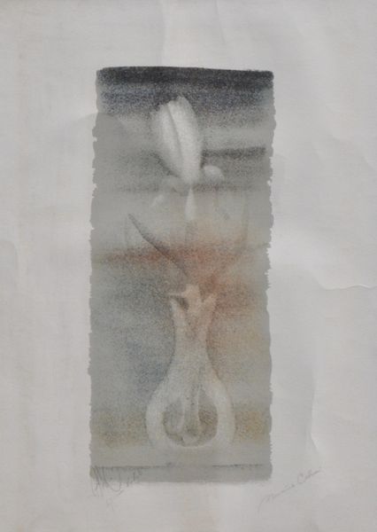 Curator: At first glance, Salvador Dali’s mixed-media piece, L’ange de l’alchimie, or "The Angel of Alchemy", from 1974, presents a real puzzle, doesn't it? Editor: Oh, it does! It hits me as a very vulnerable spirit caught between raw organic growth and some spectral presence... that head up there is kind of unnerving! Curator: Yes, that spectral presence. Notice how the vertical composition might symbolize transformation? Alchemists, you see, sought to transform base metals into gold and, symbolically, the soul into a higher state. The angel form echoes the soul ascending. Editor: It's beautiful the way the materials appear almost viscous, like transformation caught mid-flow. I imagine this angel leaking secrets. Curator: Precisely! Consider also the color palette: predominantly muted greens, golds, and creams. Colors that we often link with earth, with transmutation. These subdued colors carry potent psychological weight, invoking both organic decay and potential rebirth. Editor: But why an angel then? Isn’t that a Christian symbol placed within this alchemy idea? Curator: Dali often juxtaposed seemingly opposing symbologies, finding points where they resonate. Angels are messengers, intermediaries; and alchemy at its core is all about mediation—between the material and spiritual planes. The angel here could represent the transformative power bridging earthly substance with divine knowledge. Editor: Divine knowledge you say…I keep being drawn to what looks like spatter, but precise. Curator: Yes! While seemingly spontaneous, even accidental, Dali controlled such "accidental" effects masterfully. He considered it the outpouring of the subconscious. Editor: He found meaning in his dreams. No matter how unnerving the spirit head looks, there is hope here. Alchemy and spirituality may just be different faces for transformation in our lives, eh? Curator: Precisely. It pushes us to question where we seek the gold in our lives.