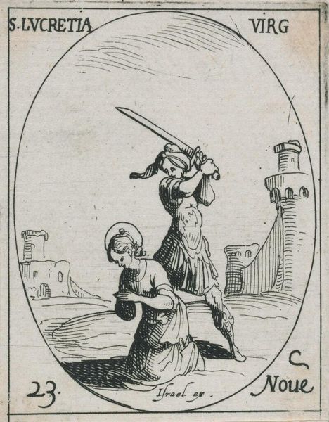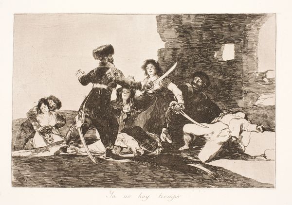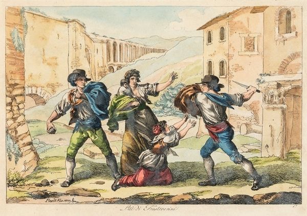 Editor: This is Bartolomeo Pinelli's etching, "Quarrel of females in Rome," from 1809. There's a real sense of movement here. The women are caught in a heated argument, perhaps even a fight, and I’m struck by how vividly Pinelli captures that raw emotion. What do you see in this piece? Curator: Immediately, I am drawn to the visual symbols embedded in this scene of apparent chaos. Consider, for instance, how the upraised stick wielded by the woman on the left connects with enduring archetypes of female rage. It almost feels like a staged drama. Does this resonate with particular folklore or social customs that were common then? Editor: I hadn’t considered it that way. It’s interesting you say "staged." I just thought they were having a row! Curator: It goes beyond a simple disagreement, I suspect. This moment likely taps into established cultural narratives around women, anger, and public disruption. Think about the architectural elements – a backdrop against which this drama unfolds. How might they speak to Rome’s broader societal context? Consider too, how fashion establishes social codes; each colour carries unique social signals, no? Editor: So, you are saying there's perhaps some inherent symbolism or social commentary being played out within the depiction of these arguing women? Curator: Exactly! And look at the reactions of onlookers such as that young boy. He seems frightened, which reminds us of art's power to reflect not just an era but its impact on those living in it. Consider if they are caught between tradition and the need to express emotion without losing reputation. Do you feel there’s something that might suggest tension within those confines? Editor: It definitely gives me a lot to think about, seeing the historical and social meanings layered within seemingly simple scenes. Curator: Indeed. Images are never just pictures; they are conduits of cultural memory. And the enduring questions of emotion still resound within these etchings.
