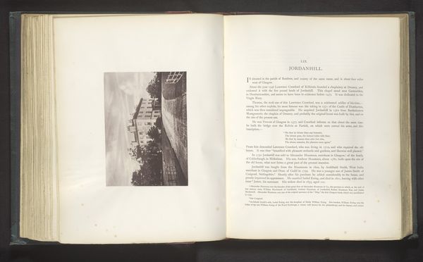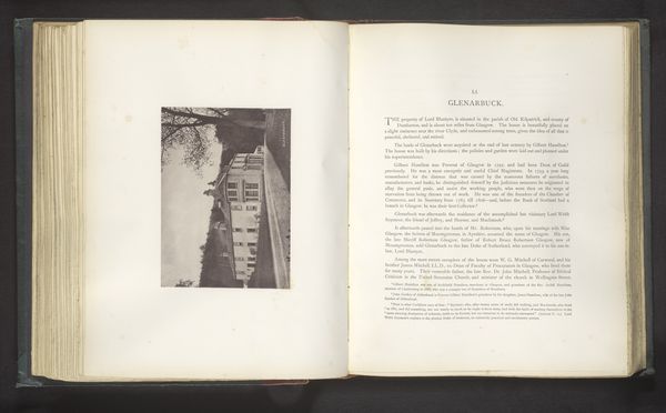 Curator: Thomas Annan, the artist, crafted this piece titled "Gairbraid," sometime before 1878. It's an albumen print, presented in an open book showcasing its rich photographic details alongside written text. Editor: My first impression is quiet and contemplative. The tonal range in the photograph is subtle and it feels like a ghost from the past. Almost like staring at an old daguerreotype, with that eerie clarity. Curator: Absolutely. Annan was very intentional about that effect. It wasn’t just about documenting a building; it was about imbuing it with a certain weight, a connection to its history. Albumen prints offered a particular aesthetic, enhancing that dreamlike quality. Editor: And, I think what strikes me here is the choice to frame it within the book itself. Placing the photograph on the page as part of this volume suggests something very deliberate about preservation and about memory-keeping. We’re not just viewing a photograph; we’re accessing a relic that carries a narrative weight. Curator: Exactly. Annan's project often explored the social landscape alongside the physical one. The architectural studies were entwined with broader narratives of Glasgow's transformation and industrialization. “Gairbraid” can also speak to Annan's interest in local histories and how institutions are entangled in broader narratives. He also created several more albums, focusing on a series of institutional constructions of Glasgow at the time, like the University. Editor: That context does add depth. The photo speaks about power structures and social identity as it pertains to urban settings. Do you think there's something about his perspective as an artist during this era that emphasizes such concerns? Curator: Oh, undeniably. There was this consciousness emerging— photographers and artists of the time wanting to engage in social critique by utilizing photography as a means to explore a new visual language, if you will. They weren't just passively capturing images; they were very carefully constructing ways of seeing and ways of remembering. Editor: So, in revisiting "Gairbraid", I sense Annan's call to attention as well. His subtle artistry provides an intriguing lens through which we are allowed to access layers of architectural memory in this photographic archive. Curator: Yes, what I see here is that it embodies so much history but in a very beautiful form and its relationship with institutional memory of that area and time. It beckons.