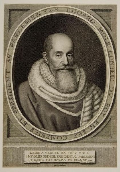 Curator: Before us, we have George Vertue's portrait of "Joannes Uytenbogaert," residing here at the Harvard Art Museums. Editor: It projects such an air of formal austerity, doesn't it? The stark black and white, the rigid pose, all framed within that ornate oval. Curator: The composition is certainly deliberate. Vertue's engraving technique emphasizes line and texture, notice the intricate detail in Uytenbogaert's ruff, creating visual interest. Editor: And that ruff speaks volumes about status and power. Uytenbogaert was a prominent figure, a leading Remonstrant theologian whose views shaped religious and political discourse. Curator: Precisely, the portrait serves as a visual signifier, reflecting his influence and position within society. The use of monochrome further accentuates a sense of timelessness and authority. Editor: It is undeniably effective, this calculated projection of authority. It prompts questions about the role of imagery in shaping public perception of historical figures. Curator: A fascinating intersection of form and function to consider. Editor: Indeed. It leaves one contemplating the layers of meaning embedded within even the most seemingly straightforward portrait.