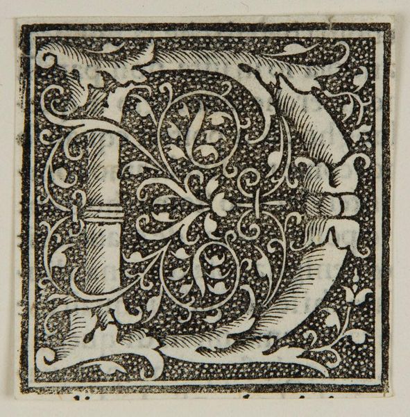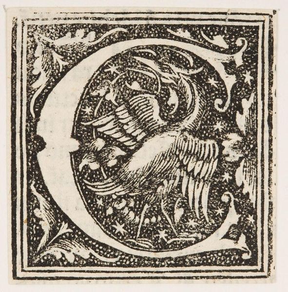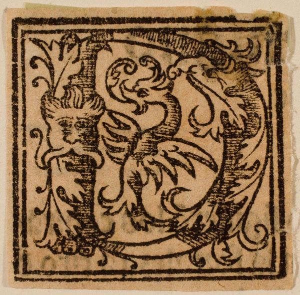 Editor: This is an initial "S", crafted by an anonymous artist. The woodcut is teeming with animal life—a bird, a lion, maybe even a dragon! What do you see when you look at this tightly packed little world? Curator: Well, I'm drawn to its density; it feels like a miniature jungle contained within this letter. Imagine the stories this "S" could begin! What hidden narratives might these creatures be hinting at, I wonder? Editor: It's funny, I hadn't considered the stories it might unlock, just the images themselves. Thank you for that perspective! Curator: My pleasure! It’s a reminder that even the smallest art object holds worlds within it.