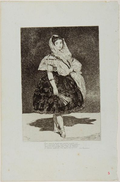 Editor: This is Edouard Manet's "Lola de Valence," its exact date unknown. It’s a small watercolor piece held by the Harvard Art Museums. I find the monochromatic color scheme conveys a certain melancholy. What do you see in it? Curator: I see a fascinating negotiation between the Spanish exoticism that captivated 19th-century Europe and Manet's own artistic intentions. The dancer's attire, the fan, all speak to a constructed idea of "Spanishness," but Manet’s quick brushstrokes seem to question the authenticity of that image. Editor: So, it's about more than just depicting a dancer? Curator: Precisely. It's about exploring how cultural identity is performed and consumed, and how easily symbols can be manipulated. The image serves as a cultural memory. Editor: That's a great point. I'll never look at it the same way again. Curator: Indeed, symbols shift and accrue meaning, reflecting the societies that create and interpret them.