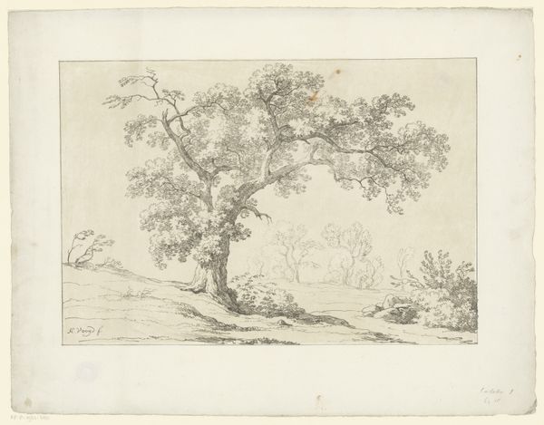 Editor: Here we have "Landscape with Two Figures on a Road under a Tree" by Pierre Jean-Baptiste van Reeth, likely created sometime between 1799 and 1866. It's an etching, isn’t it? A lovely little scene. I am struck by how quiet it feels, like a captured memory. What catches your eye in this piece? Curator: It whispers, doesn't it? This work is all about understated beauty, and a kind of quiet observation. Notice how the light dances – van Reeth uses delicate etching to capture a transient moment, a pause on a journey. Look at the contrasting textures between the foliage and the open sky. Where do your eyes tend to linger? Editor: I keep coming back to the figures; they seem so small and almost swallowed up by the landscape. Curator: Exactly! We find ourselves contemplating the Romantic era's big questions. Are we, as humans, dwarfed by the natural world? What stories might these figures be enacting beneath the leafy canopy? The tree itself becomes a protagonist, a silent guardian. Van Reeth almost makes the print seem as if it were taken straight from his personal sketchbook. Don't you think? Editor: Definitely. It does have an intimate, personal feel to it, like we’re getting a glimpse into his private world. I hadn't considered how the Romantic movement plays into the size of the figures. It gives the work a deeper feeling. Curator: Indeed! Art invites us to reflect, interpret, and bring our own experiences to the viewing. Perhaps Van Reeth wanted us to imagine ourselves walking down that very path. Editor: It’s fascinating to see how much meaning can be packed into such a simple scene. Thanks for sharing your insights.