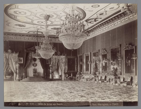Curator: This photograph, taken between 1887 and 1900 by a photographer known only as X phot., presents Marie Antoinette's bedchamber within the Château de Fontainebleau. The image encapsulates the opulence associated with the French monarchy. Editor: It certainly does! The immediate impression is one of overwhelming texture. From the elaborate wallpaper to the dense ornamentation of the bed, it's a symphony of applied artistry. One almost feels the weight of the fabrics and carvings. Curator: Indeed. The photograph allows us to consider how the spaces occupied by historical figures like Marie Antoinette were meticulously crafted to project power and status. Every element served a purpose in maintaining a certain image. Editor: Absolutely, and let's not forget the immense amount of labor required to produce all of this. Someone had to weave those fabrics, carve those embellishments, and install it all. Considering the intense detail makes you consider who was making it, and for what reason. The craft is at once obscured and elevated. Curator: And how it’s now captured and disseminated. The image here performs a role itself, bringing this carefully constructed interior to a much broader public than ever intended. Editor: Exactly. And the black-and-white medium mutes the color, so that we really must look closely to see the detail of all this artistry, focusing our attention to the hand that produced it. The wallpaper alone – imagine the printing, the application! It speaks volumes about the economics of the era. Curator: Seeing this also calls into question what the role of such places is in our world now. Preserved and open for viewing by all, they tell a more multifaceted story. Editor: I completely agree. Looking through this photograph, I see not just Marie Antoinette's bedroom, but echoes of the craft and labour that brought this all to fruition. That's powerful.