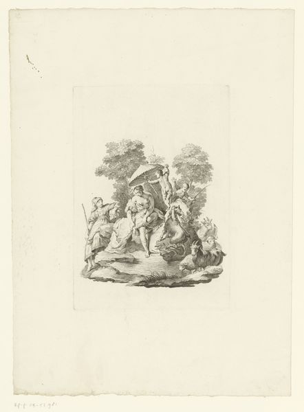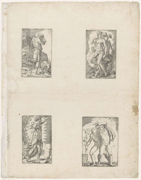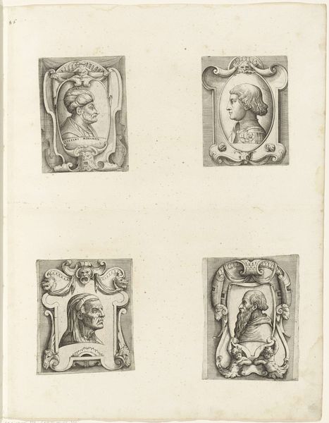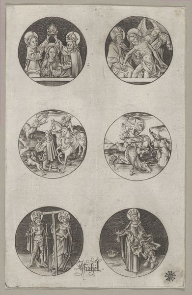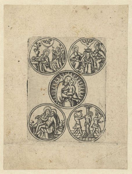 Martin Speer created this work, "Holy Family, Anna and Maria, Christ on the Cross and Joseph with Child," sometime before his death in 1765. Executed with ink on paper, the composition is divided into four distinct scenes that draw the eye across its surface. The use of tight, controlled lines gives form to each religious vignette, yet the overall arrangement resists a singular narrative focus. Speer’s choices in composition invite us to consider how meaning is constructed through juxtaposition and contrast. Take, for example, the varying shapes—rectangles alongside an oval—which create a visual rhythm that is both ordered and unpredictable. This reflects a broader Baroque interest in complexity and the blending of different elements to create a dynamic viewing experience. Speer's print functions not merely as a religious artifact, but as an exploration of form and structure, reflecting how artists of the period engaged with the interplay between established themes and innovative visual arrangements. The piece invites us to actively participate in making meaning.