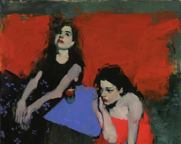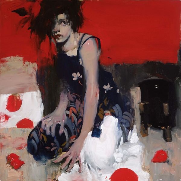 Editor: Milt Kobayashi's 2021 oil painting, "Forgotten Strawberries", strikes me immediately with its almost melancholic air and impasto texture. What draws your eye when you examine it? Curator: Immediately, I’m drawn to the structural contrasts. The fluidity of the brushstrokes creating the figure is juxtaposed with the sharp, almost brutal application of paint suggesting the strawberries. Consider how that textural difference informs your experience of the piece. Does one element dominate? Editor: I notice how the subject's gaze is fixed on the viewer. The lost strawberries on the right seem to be less important than her stare. So it's like there are two structures in one. How do the visual components support this relationship? Curator: Precisely. Let us consider the color palette. The subdued background, largely neutral, forces attention onto the red and pink hues, especially around the face and the strawberries themselves. Observe how the painterly style affects our perception; does it feel unfinished or deliberately fragmented, drawing the gaze toward areas of denser texture? Editor: Now I see it! It does feel deliberately fragmented. Almost as if the background fades into insignificance to sharpen focus on her forlorn gaze. Does the painting’s construction lend itself to expressionism? Curator: Yes. But more interesting, it blends both Neo-Expressionistic features (notice, if you will, that emphasis on raw emotion, almost bordering on disquietude, expressed through subjective perception). Yet, it contrasts in ways that prompt engagement beyond simple thematic decoding. Is it enough for the strawberries to merely exist? Does it really represent 'forgotten strawberries' or could they represent moments frozen within a fleeting memory? Editor: I learned something new from looking at it that way! It’s about the dynamic between forms and colours that creates emotional impact, as you mentioned. It makes it feel less 'forgotten' and more preserved as raw emotion. Curator: Indeed. A powerful example of how a piece's value resides less in its subject, but how it renders material and meaning interdependent.