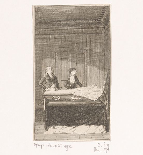 Daniel Nikolaus Chodowiecki created this print, "Charlotte spreekt met haar man over geld," using etching. Chodowiecki was a prominent artist in 18th-century Berlin, deeply engaged with the Enlightenment ideals that were circulating at the time. His work offers a fascinating window into the era's evolving social norms. In this domestic scene, we witness Charlotte in conversation with her husband about finances. While seemingly a simple exchange, consider the cultural context: what does it mean to see a woman engaged in matters of money during this period? Does the piece challenge or reinforce prevailing gender roles? Chodowiecki's prints often invite us to reflect on the intimate dynamics of daily life and the subtle power plays within them. This image captures a moment of negotiation but it leaves us to ponder the negotiations within marriage itself. What does it mean for Charlotte to speak?