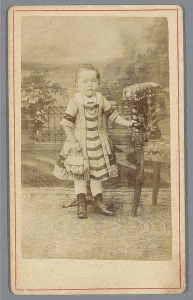 Louis Robert Werner made this portrait of an unknown girl next to an armchair in Amsterdam, using photography. The photograph's sepia tones and the girl's composed stance evoke a sense of stillness, almost melancholy. Werner carefully arranges the composition with a clear interplay of textures. The smooth backdrop contrasts with the ornate details of the armchair's tassels, the intricate carpet pattern, and the ruffles of the girl's dress. These elements create visual interest while reinforcing the formality of the portrait. Note how the girl's pose, leaning slightly on the chair, echoes a societal expectation of decorum. The photograph acts as a cultural artifact, capturing not just an image but also the codes and conventions of its time. By meticulously staging the scene, Werner constructs a representation of childhood framed by the aesthetics and social norms of the era. The photograph invites us to consider the relationship between representation, identity, and the gaze of the viewer.