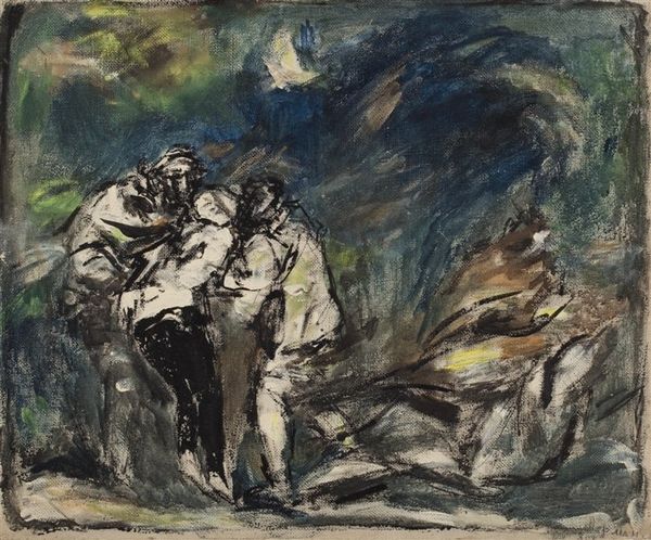 This is a study for ‘The Harvest Moon’ by George Hemming Mason, who lived in the 19th century. It's made with watercolor and gouache, which are not industrial materials but pigments that have been used by artists for centuries. The earthy quality of the paint lends itself beautifully to this scene of laborers working through the night. You can see that Mason has applied the materials in thin washes and opaque strokes, almost as if building up layers in a field. The figures emerge and disappear with each glance, with the harvest under the moonlight. The labor of harvest is not easy, and this study highlights the raw toil involved in working the land, with the artist revealing the physical effort put into this type of work. ‘The Harvest Moon’ and studies such as this ask us to question the value we place on labor and the artistic traditions used to depict everyday life.