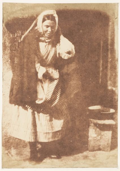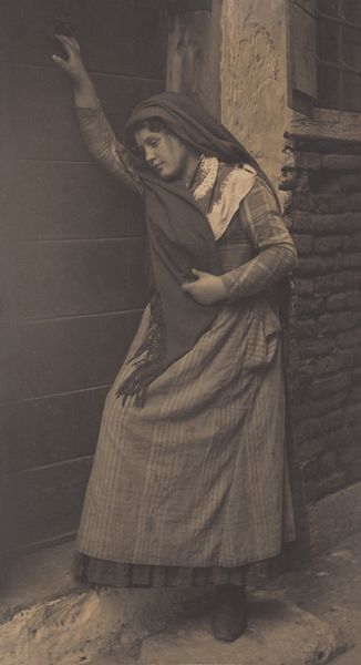 Editor: This is "Portret van een meisje in klederdracht met kruik in de handen, vermoedelijk in Volendam," or Portrait of a girl in traditional dress holding a jug, supposedly in Volendam. It’s a gelatin silver print, dating from around 1900-1910 by G. Hidderley. The photographic medium really evokes a quiet stillness. What strikes you most about its formal qualities? Curator: The tonality, the carefully controlled gradation from dark to light, is crucial. Observe how the subtle shifts in value articulate form, particularly the volume of the jug and the delicate folds of her costume. Note the strategic placement of light – how it models the planes of the face, even though it is shadowed, and highlights the texture of the fabric. These create visual interest and depth. Editor: It's a beautiful composition! The downward gaze and obscured face definitely contribute to this solemn feel. What effect does that have on the photograph as a whole? Curator: Precisely! It directs the viewer’s attention downwards. The repetition of vertical lines in the striped fabric and the pitcher itself reinforces the composition’s overall direction. Moreover, consider the negative space: it frames the subject, intensifying the image’s intimacy. It prompts us to contemplate the interplay between light, shadow, and form to build its power. Editor: That is a fantastic perspective! I never considered how crucial the dark spaces could be. It’s interesting to consider how that pushes forward both form and message. Curator: Indeed, and one can ponder if it's Hidderley using this space and light to emphasize themes such as labor or a sense of melancholy in a common genre portraiture setting. Editor: This has been incredibly helpful; I am now thinking about photography's capabilities in conveying complex formal dynamics that evoke deep human experience.