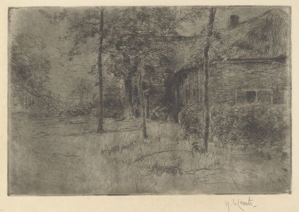 Karl Peter Burnitz rendered this drawing, Hut in the Swamp, using graphite and possibly charcoal. The artist employed a soft blending technique, using these materials to create tonal variations and textural effects on paper. The laid paper provided a receptive surface for the graphite and charcoal, allowing Burnitz to build up layers of tone and create subtle gradations of light and shadow. The softness of the materials also lent itself to creating a hazy atmosphere, enhancing the sense of tranquility. However, it is important to consider the broader social context in which this drawing was made. Burnitz's choice of materials and subject matter reflected an interest in Romanticism, and the value of craft and hand production. By emphasizing the artist's skill, Burnitz challenges traditional distinctions between fine art and craft.