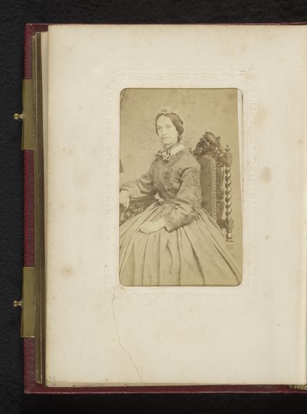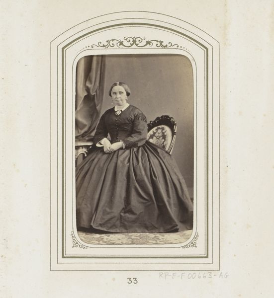 Curator: Looking at this portrait, I'm struck by how it captures a particular moment, or perhaps a certain understanding, about womanhood in the late 19th century. It is titled "Portret van een zittende vrouw", dating from somewhere between 1860 and 1890. Editor: A photograph from that era always feels so weighty, doesn't it? A woman caught between stillness and, it almost seems, impatience, or something beyond what she should reveal... there is something a little sad or longing in the set of her mouth. The way she grasps the edge of the little side table, as though anchoring herself. I wonder who she was? Curator: Right, these portraits provided a critical platform for defining the Victorian ideals and expectations. There's a lot to unpack in her clothing and the pose. It represents, of course, not a singular identity but how identity was made legible – for that moment, within its frame. You might call it a study in social scripts. It tells a curated story. Editor: Well, you look at her gigantic dress, that tent of fabric! I almost feel claustrophobic just gazing upon it, it seems as if her essence, or rather her body is swamped or hidden entirely. The poor thing, and that is just "modesty" I guess? It's also strange the light does that strange, even thing, washing the texture out of her gown. There's an erasure happening right before your eyes, a reduction of particularity into this rather uniform type. She seems suspended in a photograph with, literally, a bit too much framing if I am honest, and maybe not enough... atmosphere. What materials was used? Curator: Predominantly photographic techniques characteristic of the period, but watercolor tints enhance the subject in the picture, which was fairly typical. Think about the emergence of photographic studios and how women's access and participation helped challenge traditional painterly representation. Editor: All these constraints! It's as if everything conspires to steal her essence. Makes me ache for the woman beneath the portrait... Anyway I'm seeing and thinking through fresh eyes just by observing this photograph today, and, most importantly, hearing you, with this picture as inspiration, this photograph might have been forgotten somewhere or destroyed long ago. Curator: Indeed, the image serves as both a preserved moment and a prompt for re-examining historical power dynamics and cultural ideals surrounding representation. There is some mystery within this artwork.